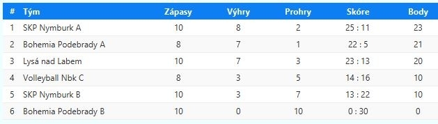 1. Loko Nymburk 6 6 0 18 : 4 12 2. ZOM Bijci Nymburk 6 4 2 13 : 10 10 3. TJ Sokol Poříčany 7 3 4 14 : 15 10 4. Volleyball Nymburk 8 1 7 6 : 23 9 5. TJ Bohemia Poděbrady B 4 2 2 8 : 6 6 6. TJ Sokol Milovice 1 0 1 2 : 3 1 7. SK Kostelní Lhota 0 0 0 0 : 0 0 Tabulka soutěže OP ženy