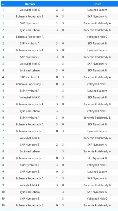 19.9. Bohemia Poděbrady - SKP Nymburk 0:3 (-18,-17,-22) 28.9. Bohemia Poděbrady - Lysá B 1:3 (-7,-16,20,-20) 10.10. Lysá B - SKP Nymburk 3:0 (16,8,13) 10.10. Lysá B - Bohemia Poděbrady 3:0 (23,22,14) 10.10. SKP Nymburk - Lysá B 2:3 (-21,-23,22,27,-9) 10.10. SKP Nymburk - Bohemia Poděbrady 0:3 (-20,-17,-18) 31.5. Poděbrady - Lysá 3:0 (13,21.17) 7.6. Lysá - Poděbrady 3:2 (-18,17,-20,22,12) 18.6. Lysá - Nymburk 3:0 (23,23,18) 18.6. SKP Nymburk - Lysá B 1:3 (-16, 21,-20,-21) 18.6. SKP Nymburk - Bohemia Poděbrady 0:3 (-18,-25,-20) 19.6. Bohemia Poděbrady - SKP Nymburk 3:0 (7,20,21)